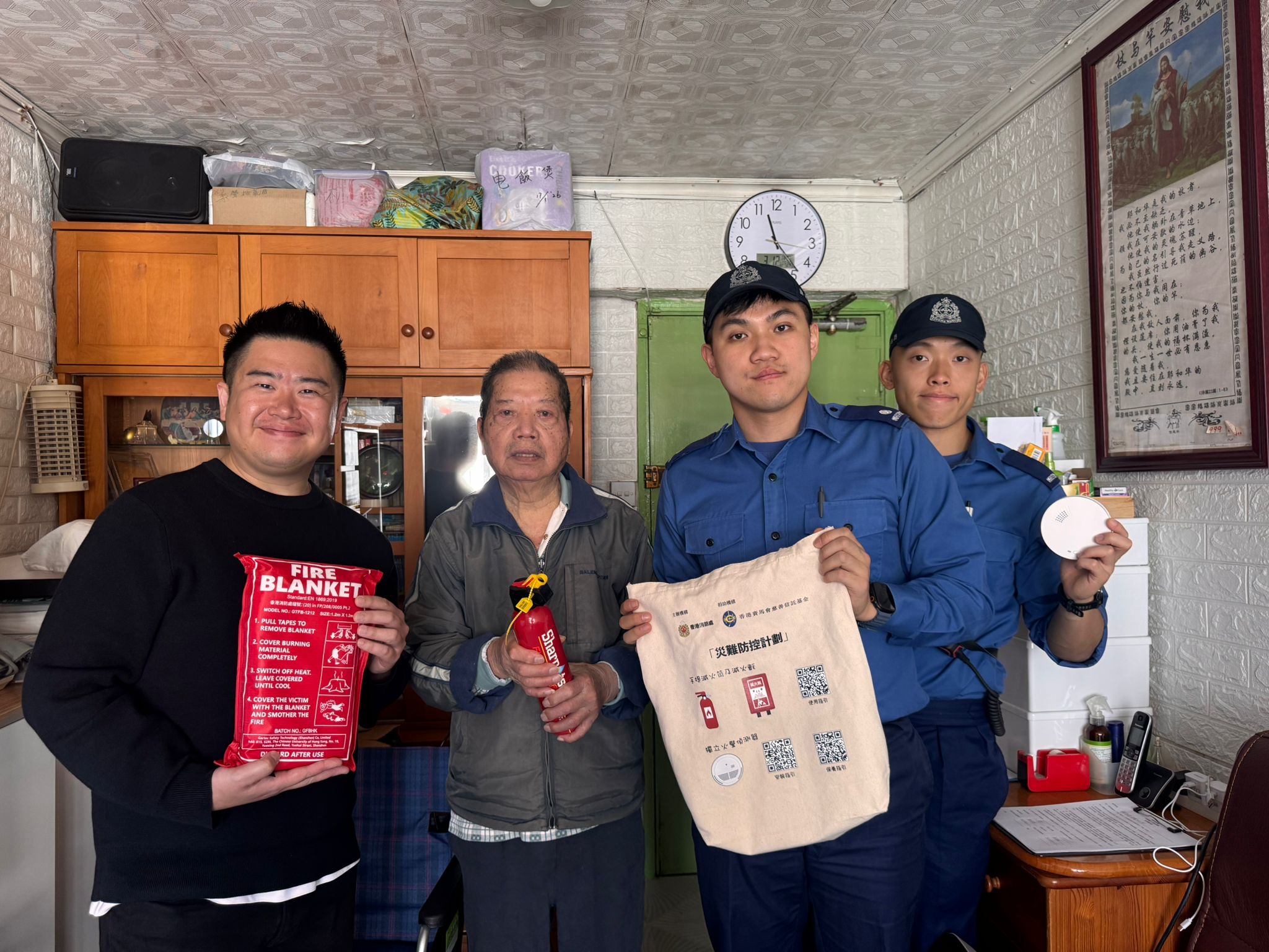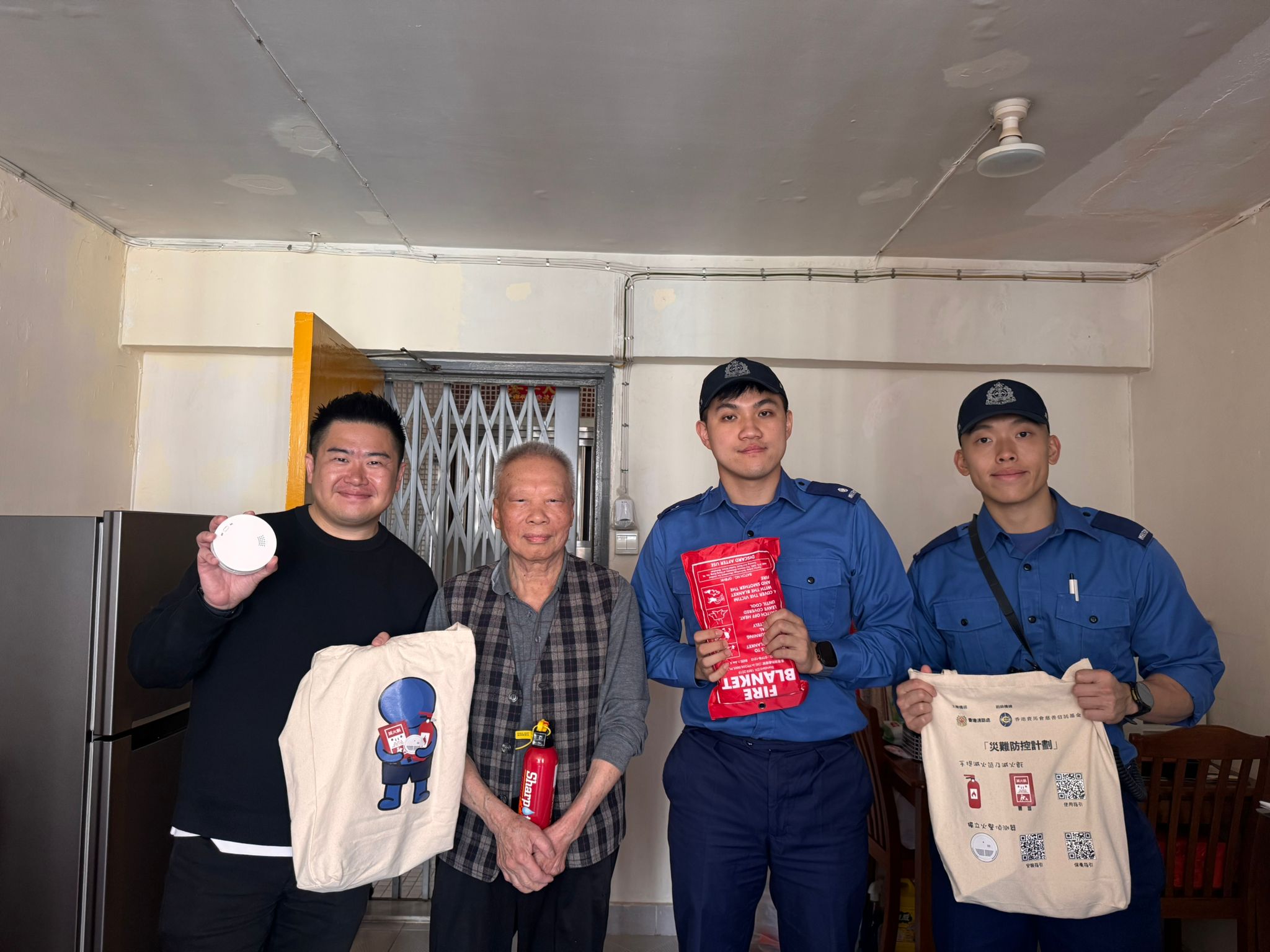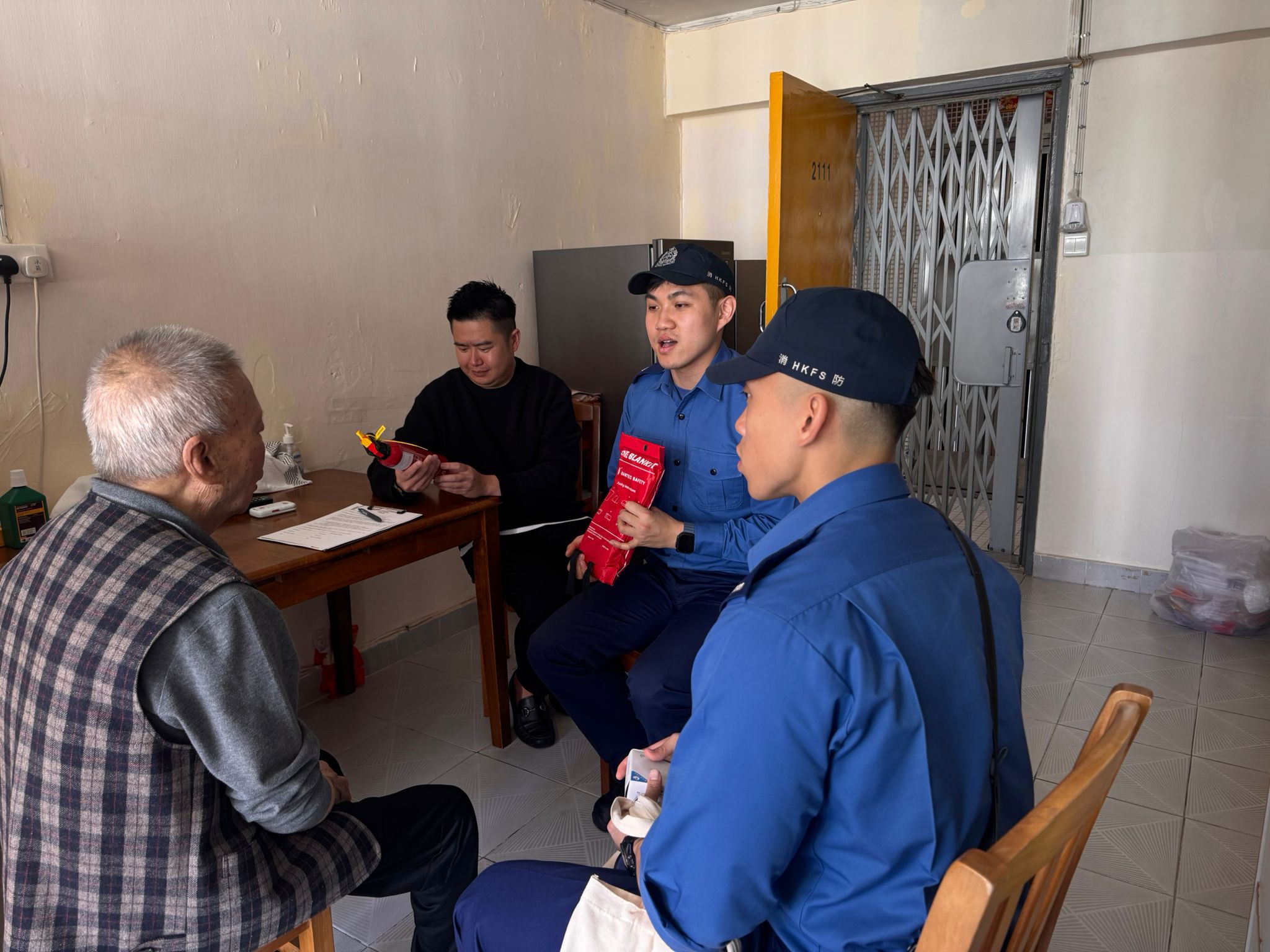 On 12.3.2026, personnel from the Tsing Yi Fire Station, together with the Tsing Yi Neighbourhood Elderly Centre, successfully carried out the Fire Services Department “Old Friends” Home Visit Scheme at Tsing Yi Estate. During the activity, 12 households of elderly residents living alone or as elderly couples were visited. The team distributed the "Three Treasures for Fire Protection" (fire extinguisher, fire blanket, and stand-alone fire detectors), assisted with the installation of stand-alone fire detectors, assessed their home fire safety conditions, promoted fire response methods, and helped reduce potential fire hazards in their homes.