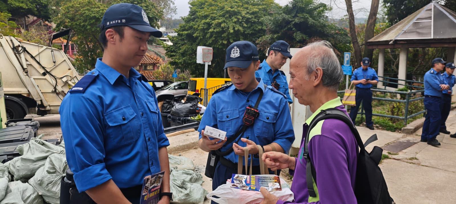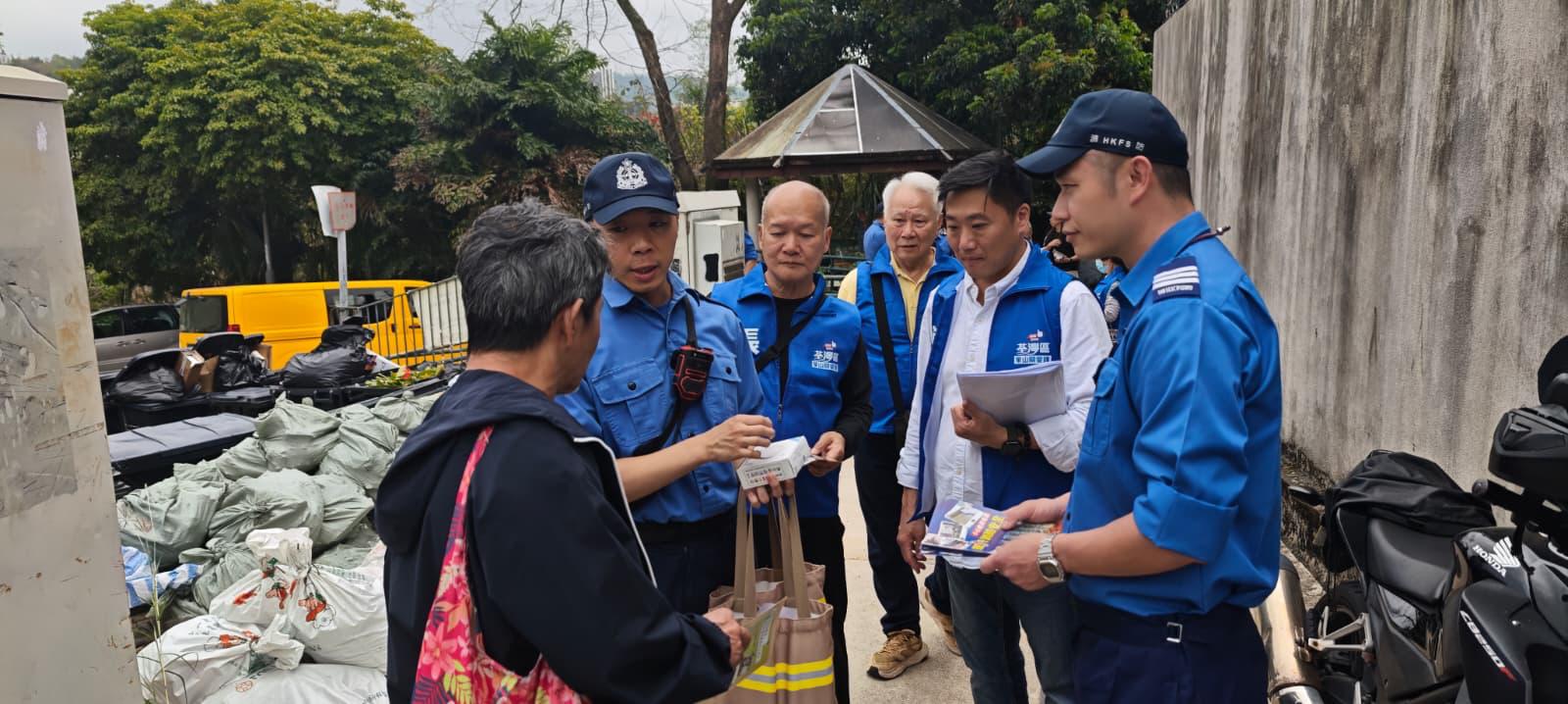 On 20.3.2026, a No.3 alarm fire incident occurred at Lo Wai Village. Subsequently, the Fire Services Department, in collaboration with Tsuen Wan District Council Member, Tsuen Wan Care Team and Tsuen Wan District Fire Safety Committee, launched a "Hot Strike Campaign" fire safety education activity at the affected village. They distributed stand-alone fire detector, fire safety pamphlets and shared fire prevention promotional videos with nearby residents to enhance public awareness of fire safety.