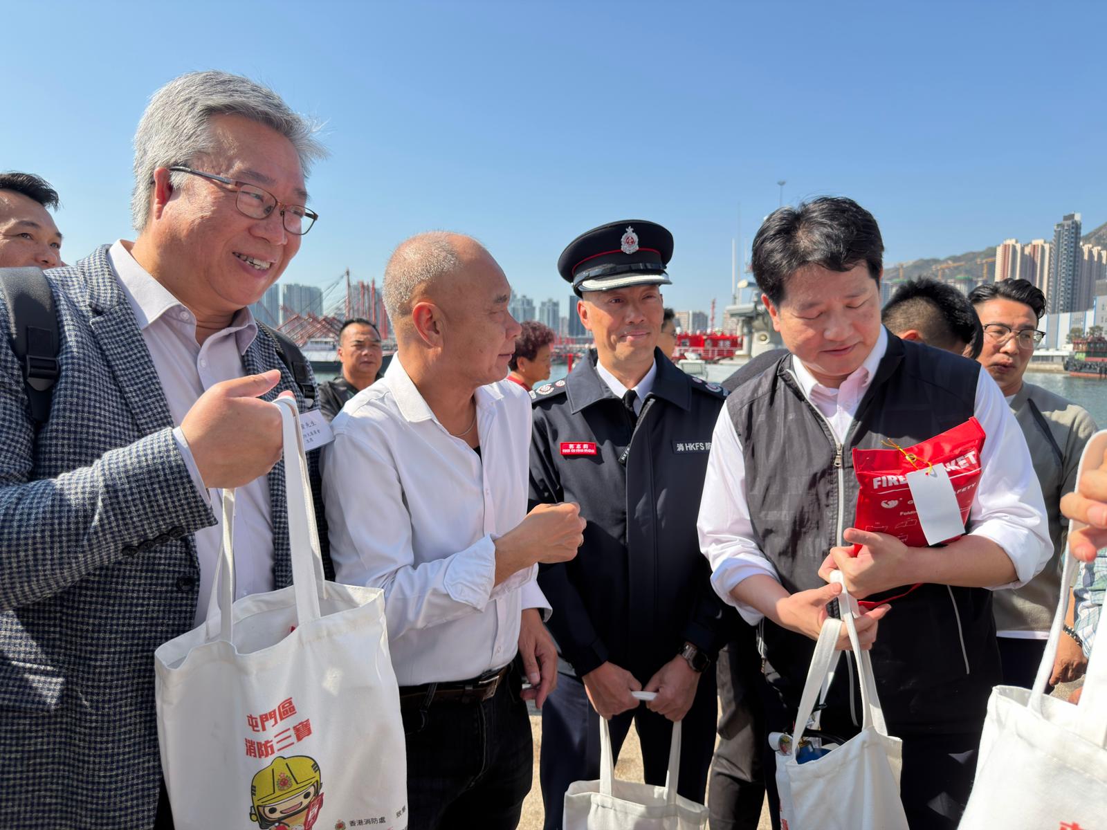 Legislative Council Member, Mr. CHAN Pok-chi, MH, JP (First from right), Chairman of the District Fire Safety Committee (TM District), Mr. LEUNG Cheuk-yin (First from left), Commander 'West' (NTN), Mr. KWOK Chi-kwan (Second from right) and Chairman of the Hong Kong & Kowloon Fishery Association, Mr. CHOW Shui-kan (Second from left) distributed ‘three treasures for fire protection’ to ship owners.