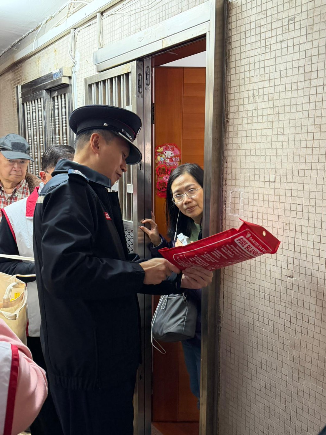 活动中不但向住户派发「防灾应急包」,当中包括灭火筒、灭火毡、独立火警侦测器和防烟头套。期间亦教育居民及管理员使用消防喉辘的步骤和口诀「破,转,拉,射」。我们亦探访居民,评估其家居防火安全状况,向他们推广应对火灾方法和减低家居的火警隐患。