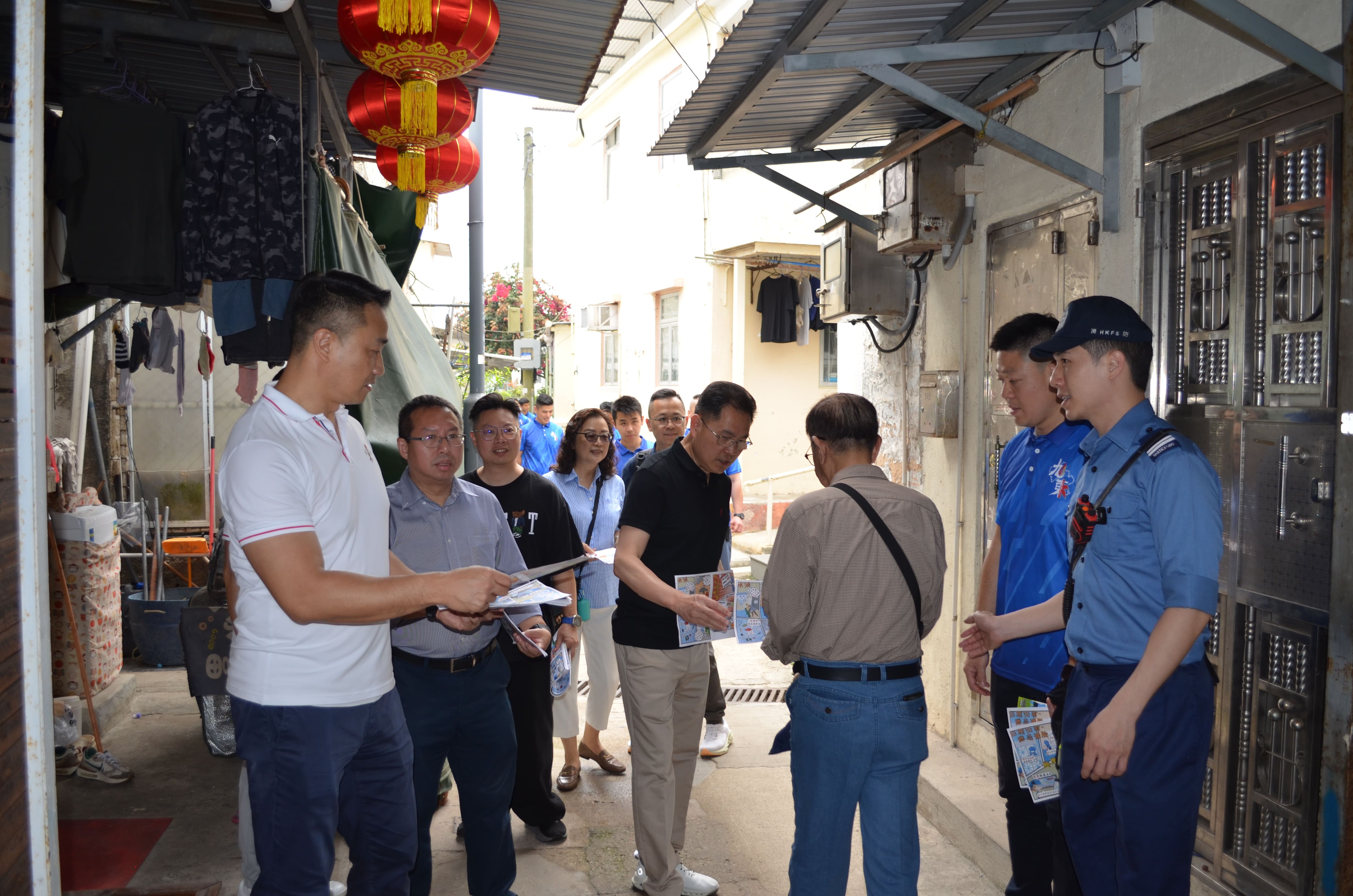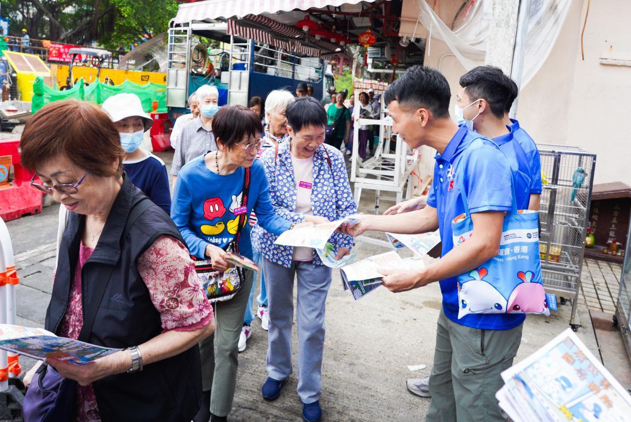 消防處分區指揮官(九龍東)郭威信先生在三家村向居民派發防災應急宣傳單張