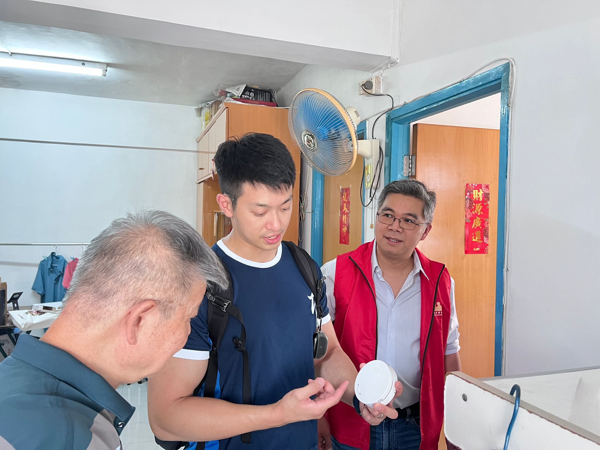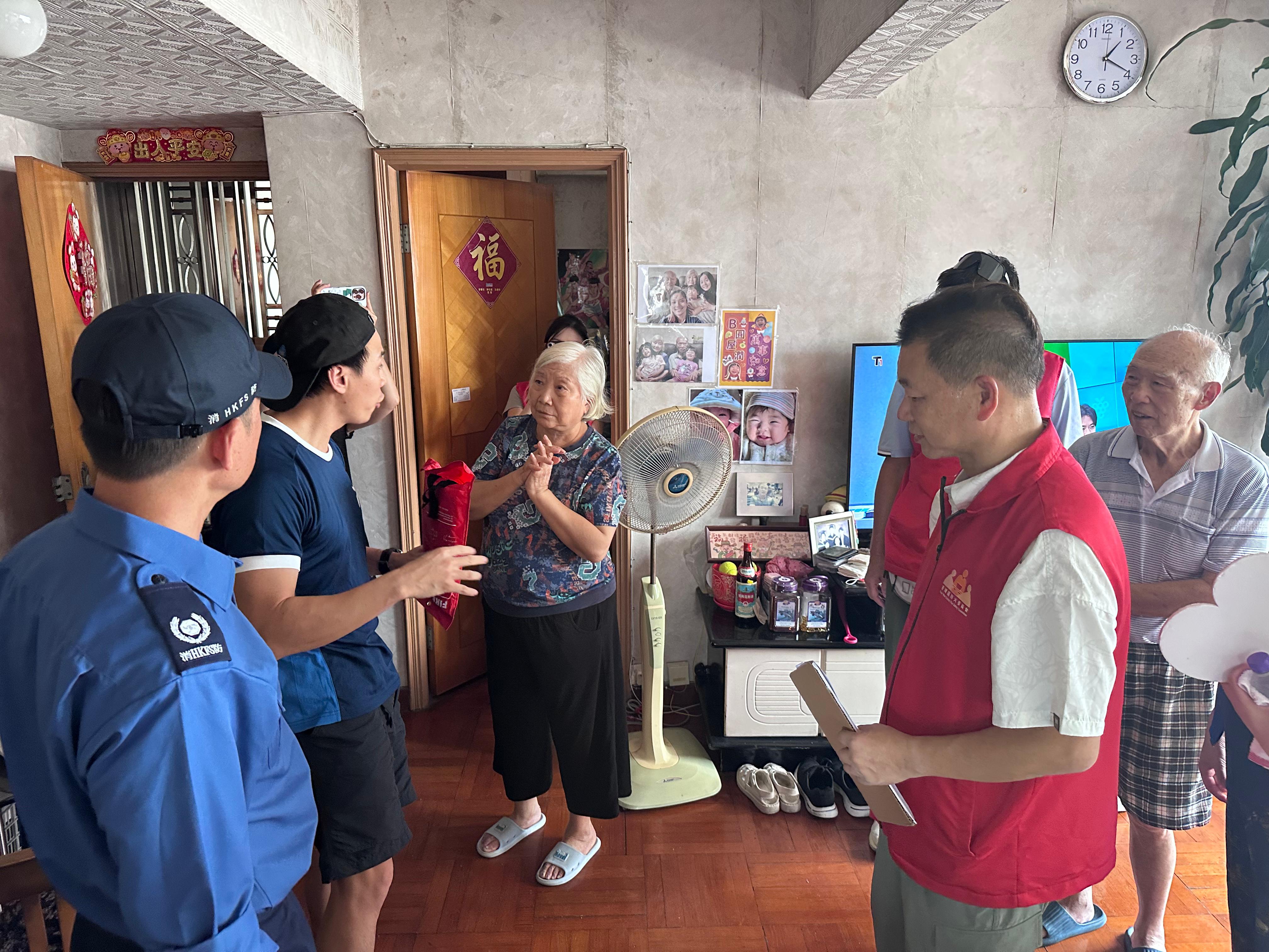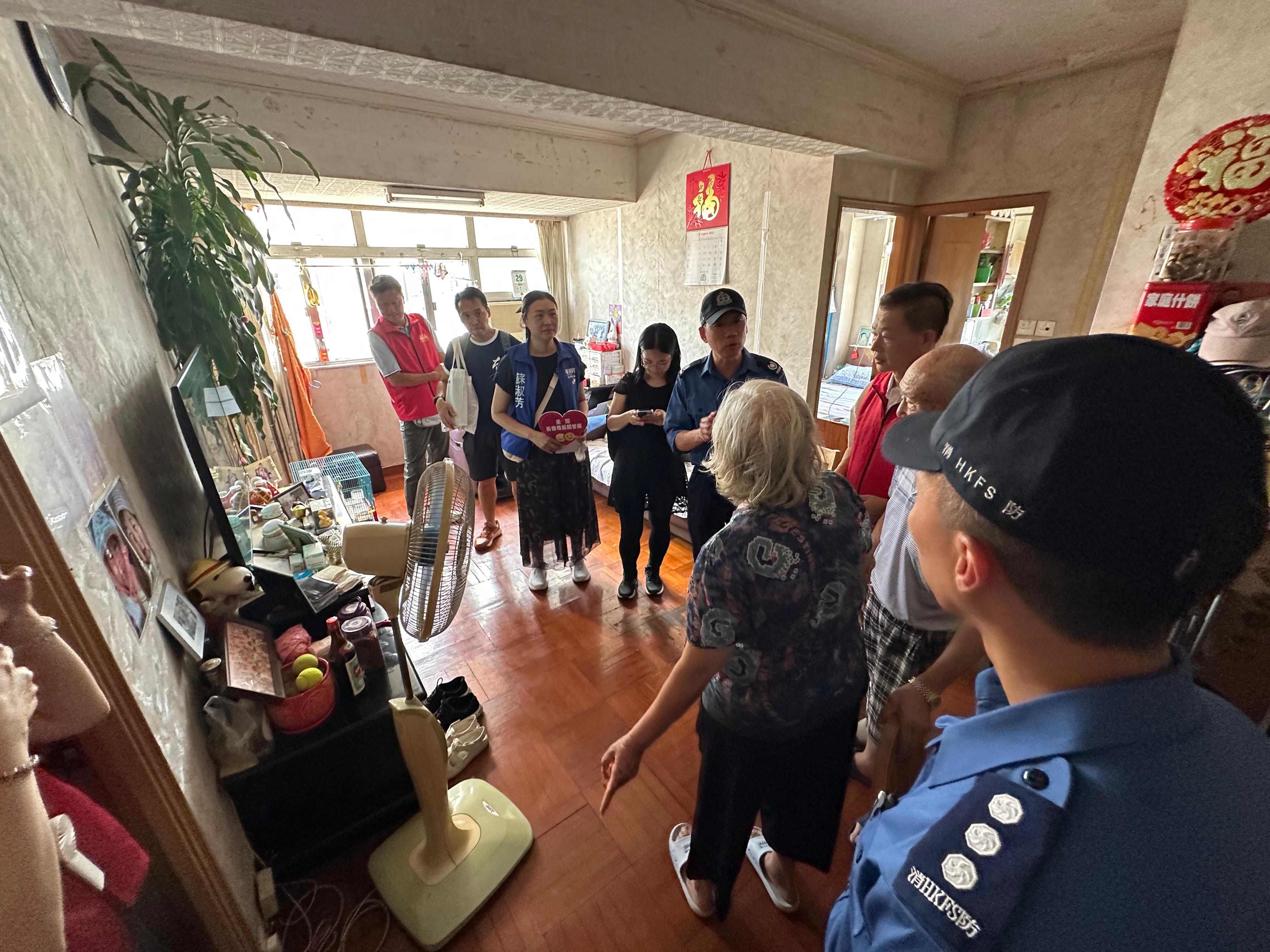 「分区公众安全队」于8月29日联同荃湾区民政事务处、荃湾区防火委员会和祈德尊关爱队人员,在享和街一带的旧式楼宇进行「家居防火安全探访」及派发「防火三宝」,探访独居和双老长者,评估其家居防火安全状况,以及派发「防火三宝」,向他们推广应对火灾方法和减低家居的火警隐患。