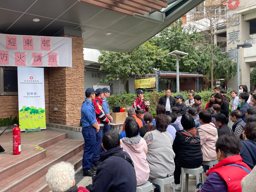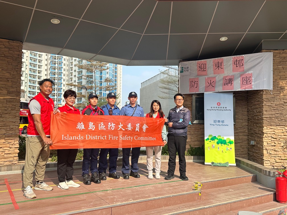 東涌消防局人員聯同離島區防火委員會委員及東涌東關愛隊成員於2026年1月20日到迎東邨進行火警演習及防火講座,向區內居民介紹「應急三識」及提供消防安全建議,並示範如何使用滅火筒及防煙頭套,以提高區內居民的防災意識。及後,東涌消防局人員及離島區防火委員會委員亦向居民派發手提滅火筒。