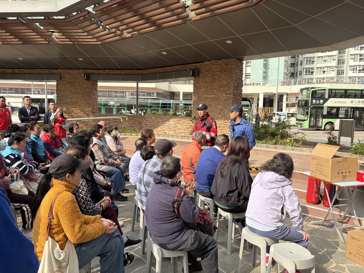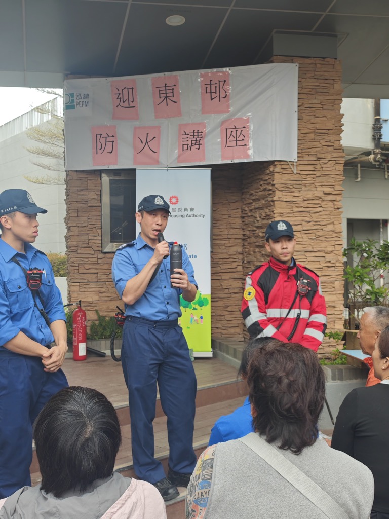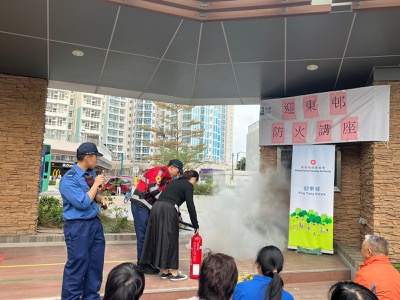東涌消防局人員聯同離島區防火委員會委員及東涌東關愛隊成員於2026年1月20日到迎東邨進行火警演習及防火講座,向區內居民介紹「應急三識」及提供消防安全建議,並示範如何使用滅火筒及防煙頭套,以提高區內居民的防災意識。及後,東涌消防局人員及離島區防火委員會委員亦向居民派發手提滅火筒。