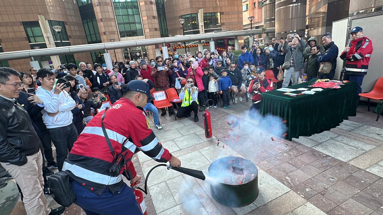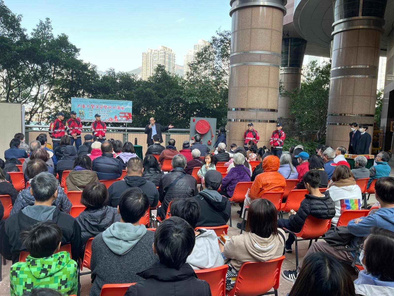 青衣消防局人員前往青衣灝景灣進行防火應急講座及火警演習,並派發防火宣傳單張及宣揚防火安全信息。