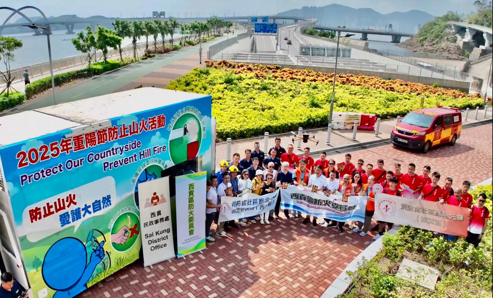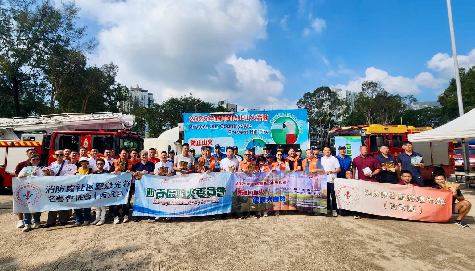 消防處聯同西貢區防火委員會、西貢區民政事務處及消防處社區應急先鋒名譽會長會(西貢區)於2025年10月18日舉辦「重陽節防止山火宣傳活動2025」,團隊走訪西貢海濱公園、將軍澳華人永遠墳場及於調景嶺港鐵站外向民眾派發防止山火傳單及紀念品,宣揚保護山林及防止山火的重要訊息。