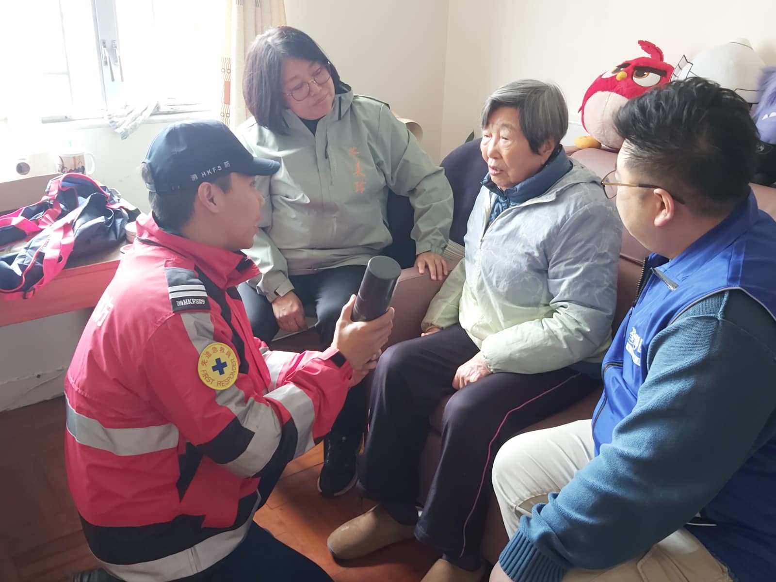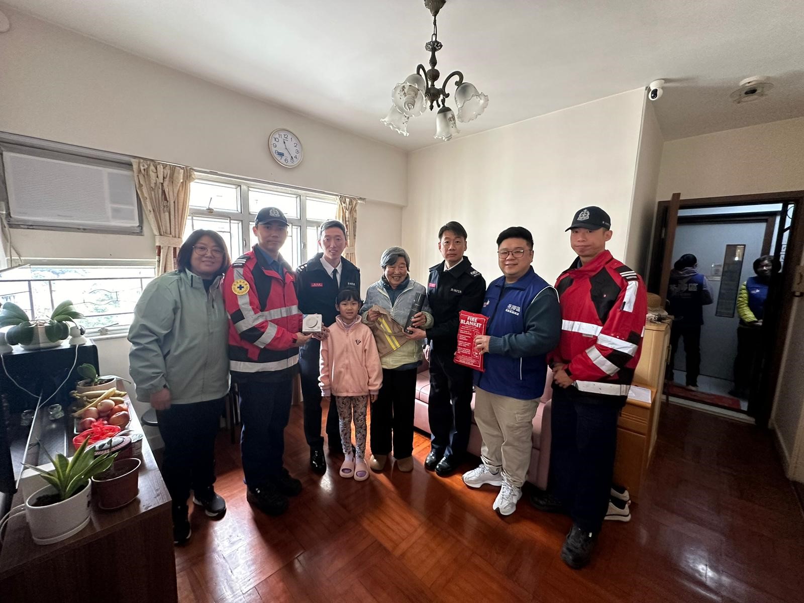 「分區公眾安全隊」於2026年2月9日聯同荃灣區防火委員會和愉景關愛隊人員,在荃灣荃景花園進行「耆鄰」家訪計劃及派發「防火三寶」,探訪獨居和雙老長者,評估其家居防火安全狀况,以及派發「防火三寶」,向他們推廣應對火災方法和減低家居的火警隱患。