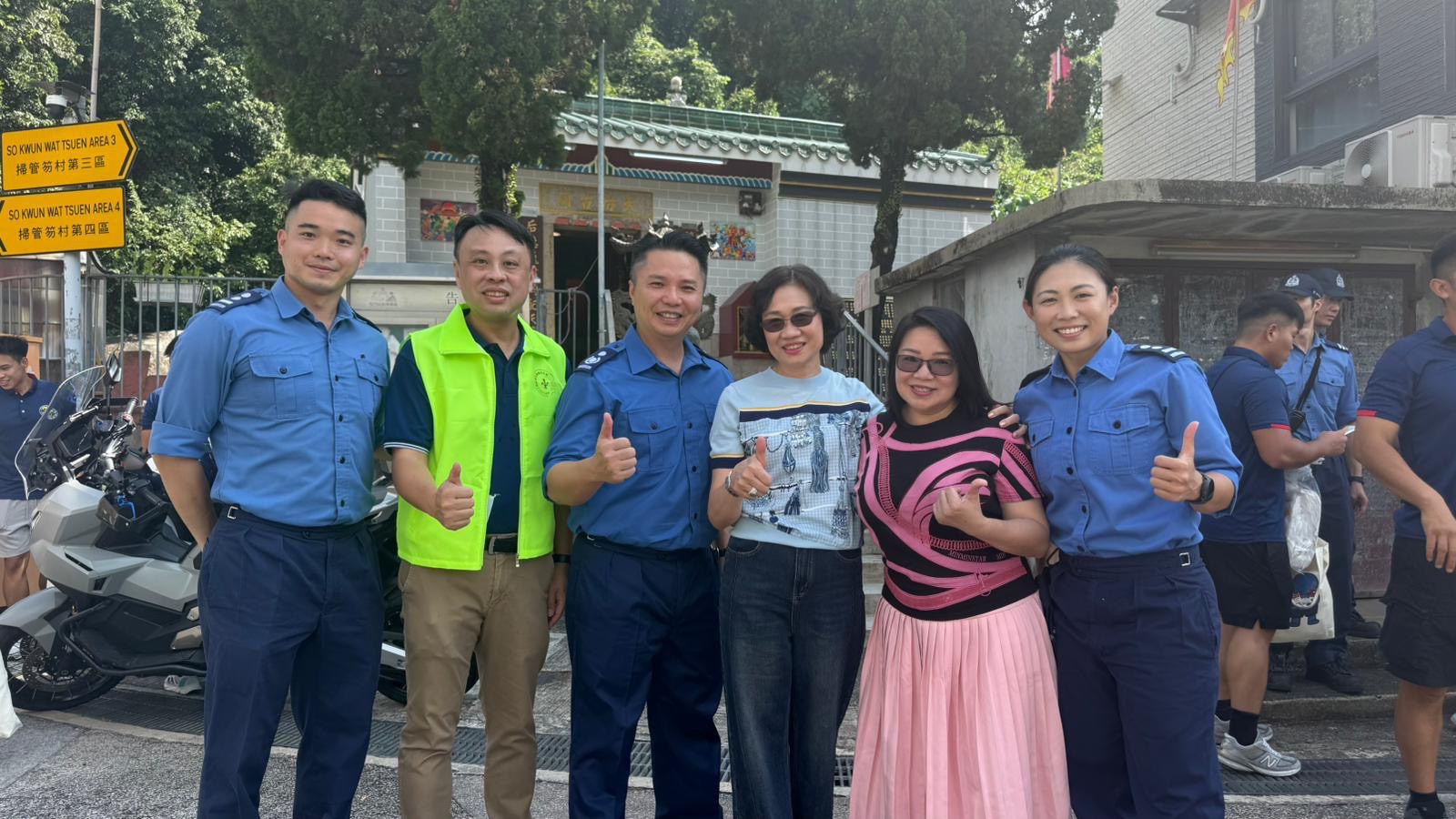 消防處社區應急先鋒名譽會長會(屯門區)主席歐倩美女士(右2)、副主席孫蔡吐媚女士,MH (右3) 以及會長曾學銘先生 (左2) 及分區指揮官 (新界西) 黃宇輝先生 (左3) 和消防屬員在掃管笏村派發防火小冊子。